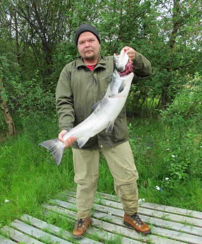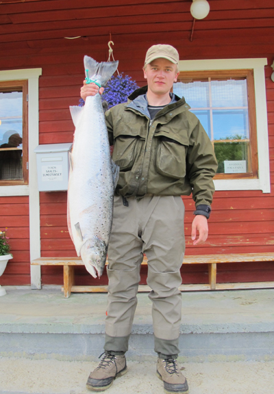 29.6.2012 Joni Talja sai Utsjoenkoskesta rannalta perhostelemalla 5,8 kg lohen. |