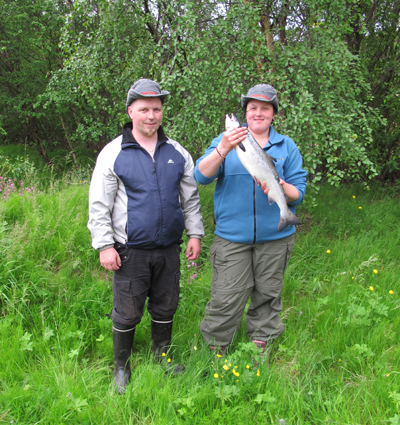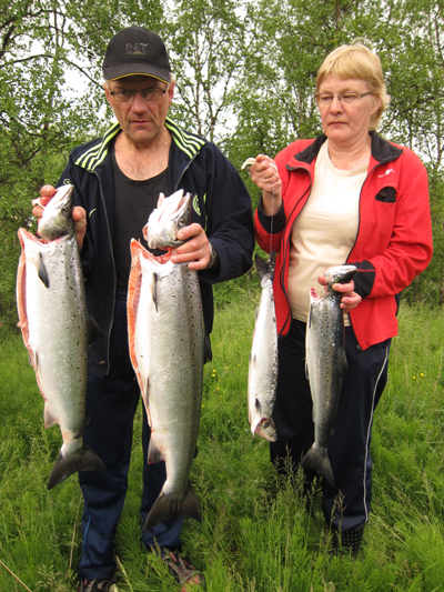 16.6.2012 Marjut ja Jorma Kokki saivat eka luvalla 3,3 kg lohijalan Jarimista. |