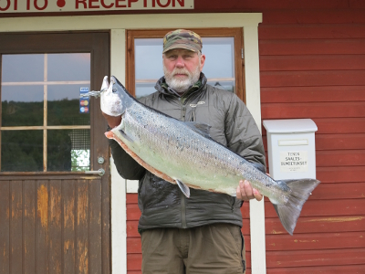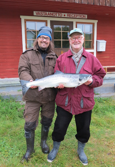 4.7.2014 Sammol ja Jorma Partinen saivat 5,1 kg lohijalan Utskosken alta. |
